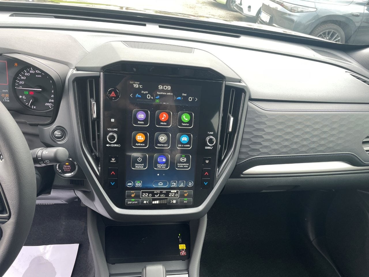 Digitální komfort: Interiér je navržen s ohledem na intuitivní ovládání. Dominantou je velký dotykový displej s bezdrátovou propojitelností Apple CarPlay a Android Auto, takže váš telefon a navigace jsou vždy po ruce.